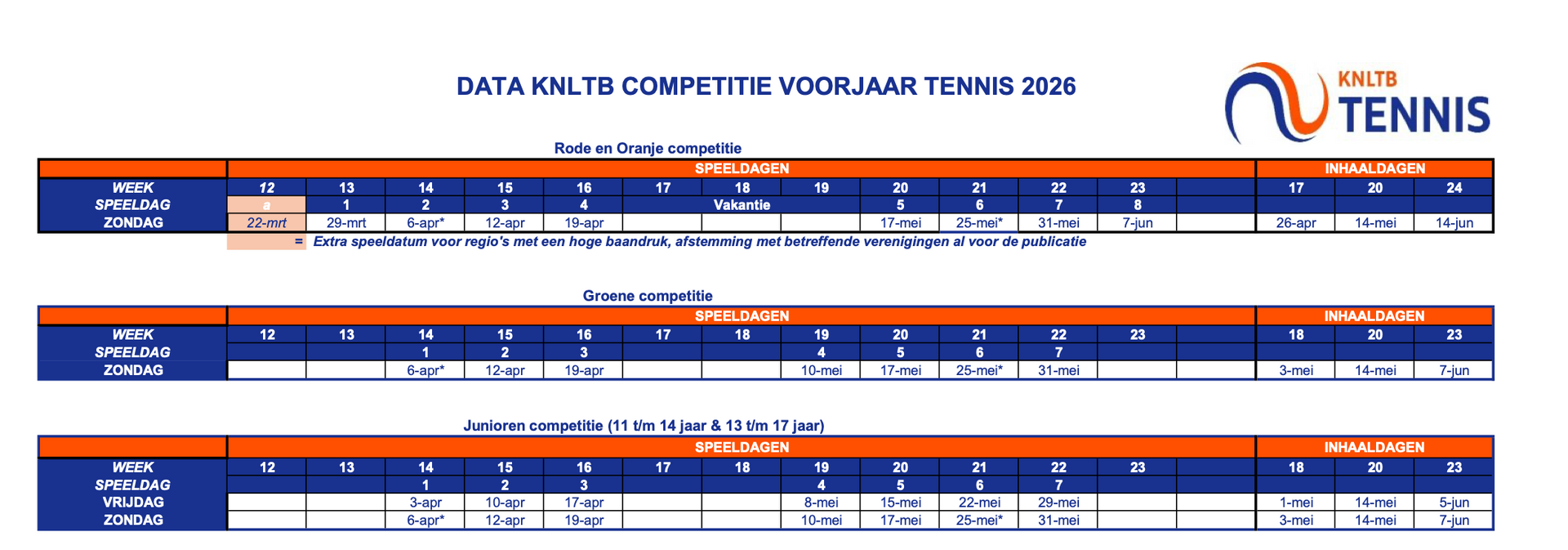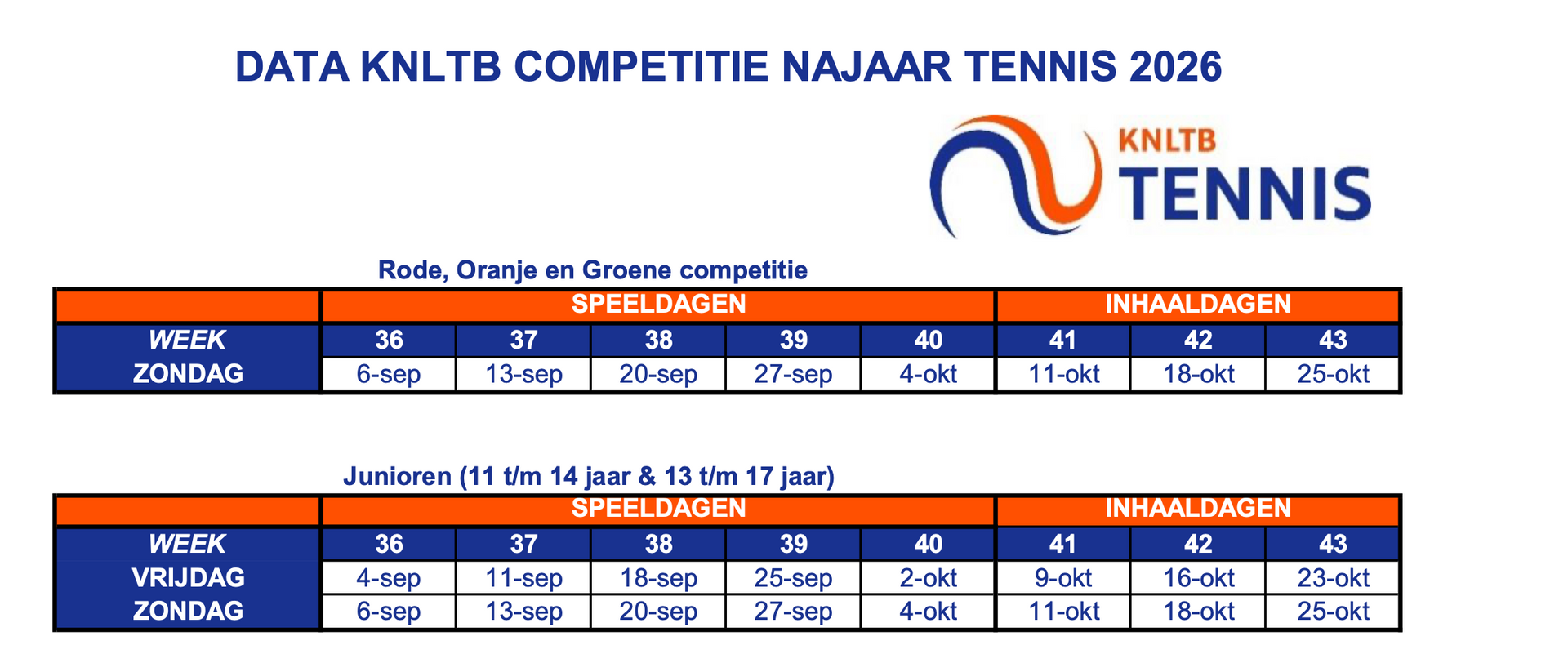 Voor oranje en groen organiseren we de KNLTB Tenniskids competitie. Kinderen in de leeftijd van 11 t/m 17 kunnen meedoen aan de KNLTB Junioren competitie. Deze competitie bestaat uit de Junioren competitie 11 t/m 14 jaar en de Junioren competitie 13 t/m 17 jaar. Er vindt een competitie in het voorjaar en het najaar plaats.